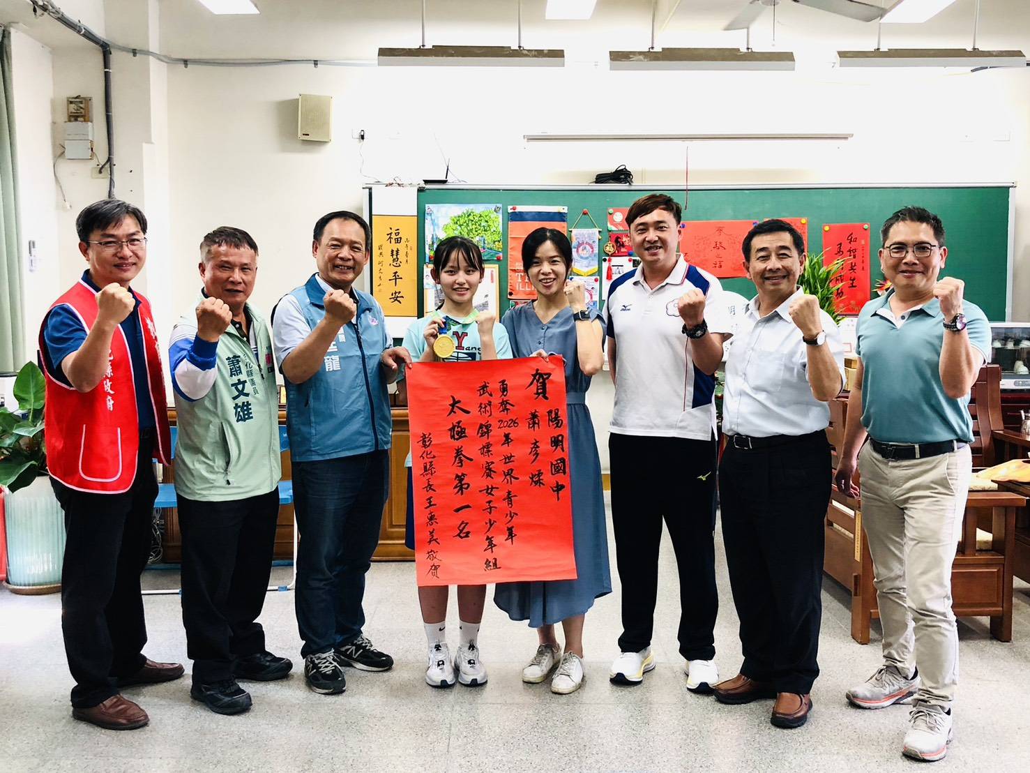 【記者王昌智/彰化報導】彰化縣基層體育再創國際佳績!陽明國中蕭彥煣選手參加「2026第十屆世界青少年武術錦標賽」,勇奪女子少年組太極拳金牌,登上世界第一。彰化縣長王惠美讚賞以傳統武術讓世界看見台灣、為國爭光,也為彰化再添榮耀。