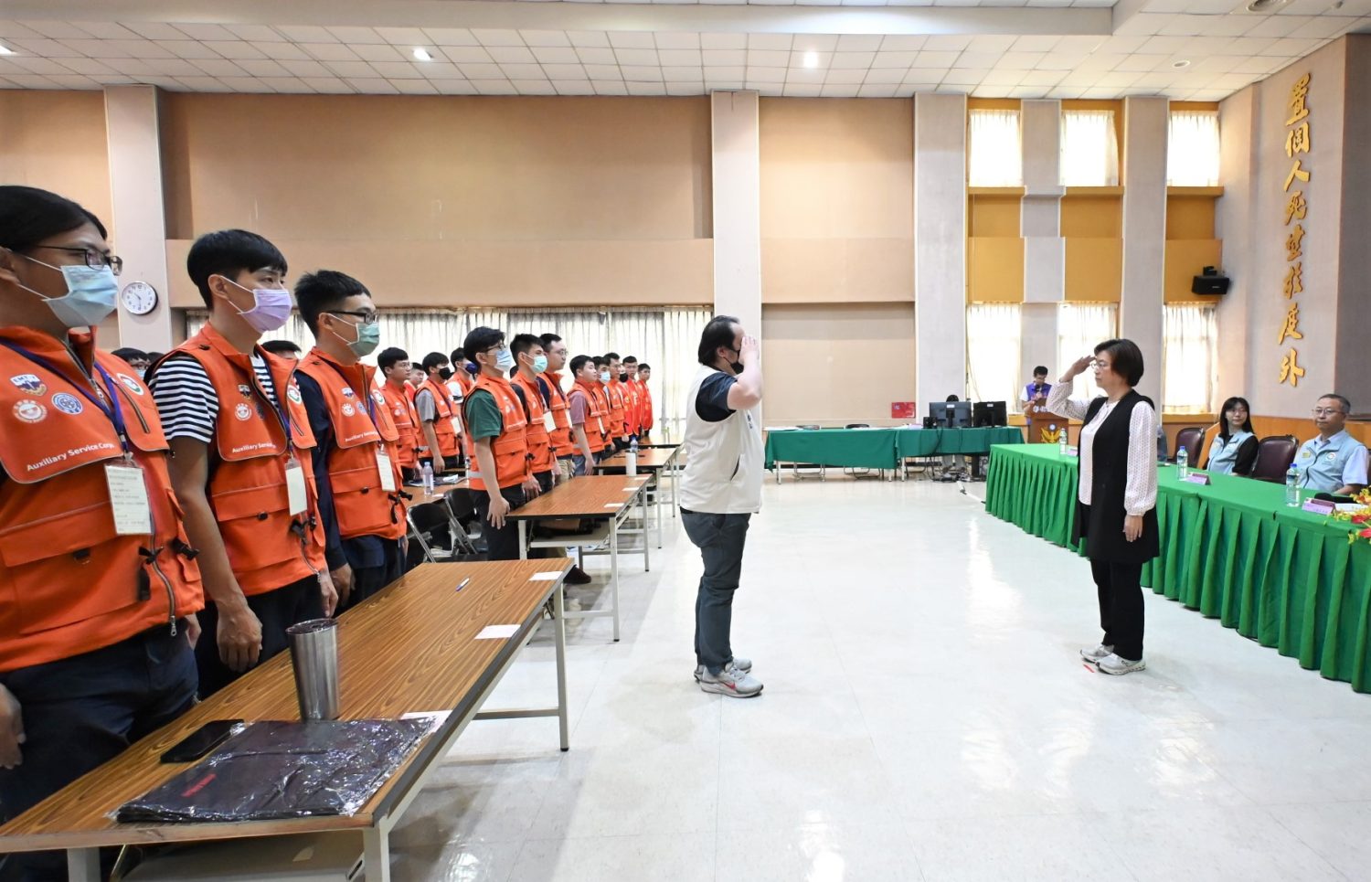 王縣長表示,本次召集演訓課程,除進行全民國防教育、帶隊官課程外,還有23處實作分組演練課程,其分組演練分別有「防災協作中心開設」、「消防救護演練」、「配售站開設演練」、「重要設施破壞搶救與大量傷患急救站開設」、「救濟站及災民收容所開設」及「治安維護演練」共6大項目。透過演習狀況實作演練,提升緊急應變及救災之儲備人力,確保在災害、非常事變或戰時有效支援,成為堅實後盾。